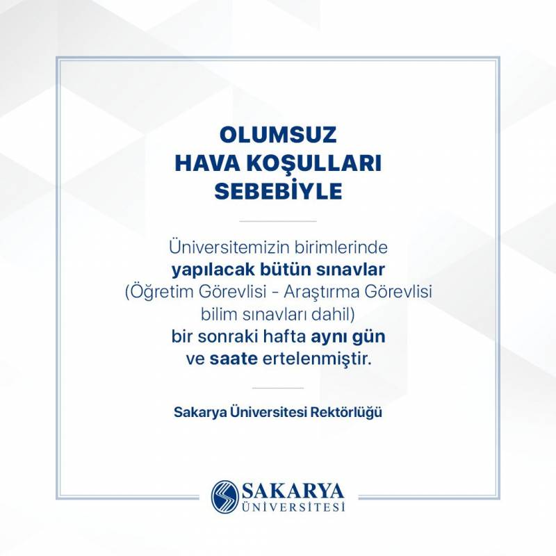Olumsuz hava koşulları sebebiyle üniversitemizin birimlerinde yapılacak bütün sınavlar (Öğretim Görevlisi - Araştırma Görevlisi bilim sınavları dahil) bir sonraki hafta aynı gün ve saate ertelenmiştir.