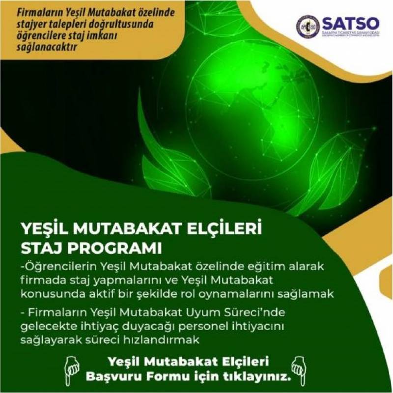 İlimizdeki firmaların, Avrupa Yeşil Mutabakatı ile öngörülen kapsamlı değişikliklere uyum sürecinde ihtiyaç duyacağı personel ihtiyacını sağlayarak süreci hızlandırmak ve öğrencilerin de Yeşil Mutabakat sürecini öğrenmelerini sağlamak amacıyla Sakarya Ticaret ve Sanayi Odası Yeşil Mutabakat Komisyonu tarafından Yeşil Mutabakat Elçileri Staj Programı oluşturulmuş ve Sakarya Üniversitesi ile iş birliği protokolü imzalanmıştır. Öğrencilerin Yeşil Mutabakat hakkında eğitim alması sağlandıktan sonra staja başlangıcı gerçekleşecektir. Sakarya Üniversitesi Mühendislik Fakültesi’nde öğrenim gören öğrencilerin 7+1 Mesleki Uygulama Stajları doğrultusunda Yeşil Mutabakat konusunda stajyer olması sağlanacaktır.