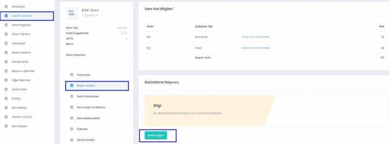 Bütünleme sınavına girme hakkı olup sınava katılacak öğrencilerin SABİS-Öğrenci Bilgi Sisteminde “Seçilen Dersler” kısmından ilgili dersi seçmesi ve “Başarı Notları” menüsünden bütünleme sınavına “Katılacağı” nı beyan etmesi gerekmektedir (harf başarı notları ilan edildikten sonra).