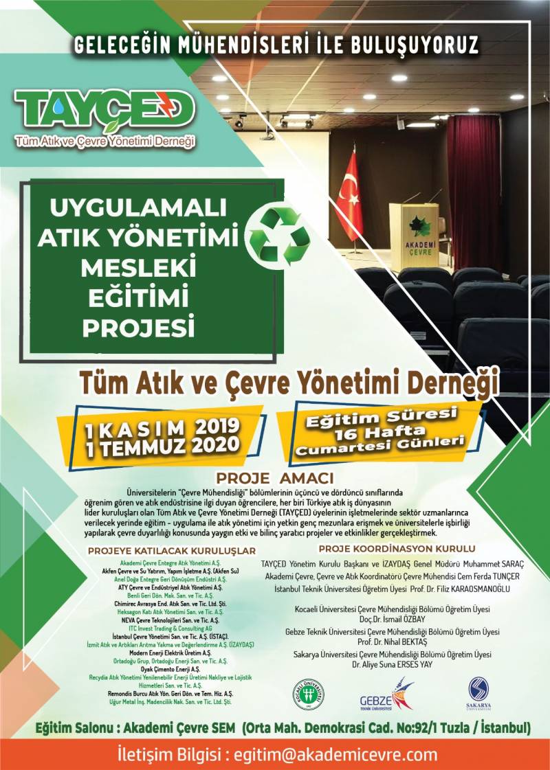 Üniversite-Sanayi eğitim işbirliği kapsamında üniversitemiz 16 çevre mühendisi adayı Türkiye'nin ileri gelen atık yönetimi şirketleri ve Çevre sektörünün tecrübeli uzmanlarından yerinde uygulamalı eğitimler almaya başlamışlardır. TAYÇED uygulamali atik yönetimi mesleki eğitim projesi 14 hafta boyunca sürecek olup, açılışı Akademi Çevre’nin ev sahipliğinde 7 Mart 2020 de yapılmıştır.