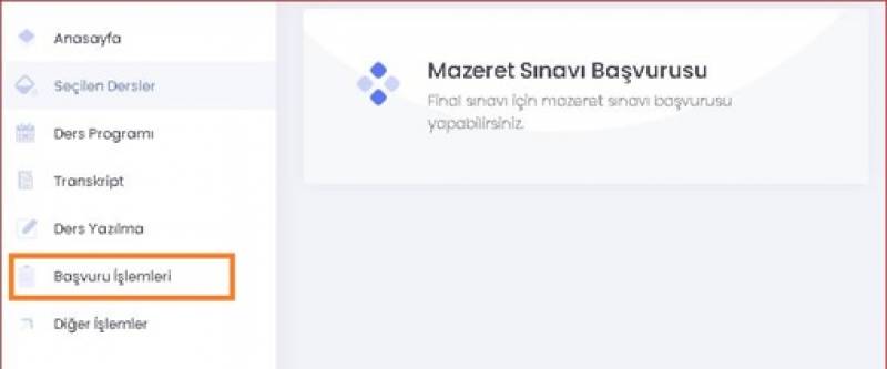 Final sınavına mazereti sebebiyle giremeyen öğrencilerimiz mazeret başvurularını Öğrenci Bilgi Sisteminden (https://obs.sabis.sakarya.edu.tr/) aşağıdaki adımları izleyerek yapabilirler. Mazeret sınavına başvuran öğrenciler aynı zamanda mazeretini ifade eden belgeleri ilgili eğitim birimlerine mail atmalıdır. Hastalık hali, yakınlarından birinin vefatı, tutukluluk ve hükümlülük hali, üniversite ve diğer resmi kurumlarca görevlendirilme hali, sınav çakışması durumu ile elektrik ve internet kesintisi gibi online sınava girmeye engel teşkil eden durumlar mazeret olarak değerlendirilir. Mazeretini belgelendirmeyen öğrencilerin başvurusu değerlendirilmez.